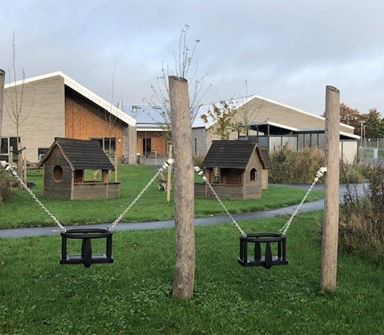 De udvendige arealer skal opleves, da det er svært at beskrive med ord. Vi har en unik legeplads i en flot natur med store træer, bakker og hvad børn og voksne kun kan drømme om.
