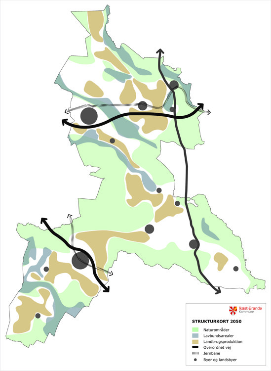 Forud for Kommuneplan 2025 har byrådet vedtaget en ”Strategi for arealanvendelse”, som er byrådets overordnede strategi for, hvordan vi ønsker, at arealanvendelsen i Ikast-Brande Kommune skal udvikle sig frem mod 2050. Strategien rummer politiske målsætninger for anvendelsen af vores arealer, og viser med et overordnet strukturkort et billede af den fremtidige arealanvendelse. Strategiens målsætninger og strukturkort er implementeret i hovedstrukturen i Kommuneplan 2025-2037, mens analyser og kortlægninger af potentialer vil danne grundlag for de kommende revisioner af Ikast-Brande Kommuneplan frem mod 2050.