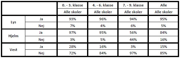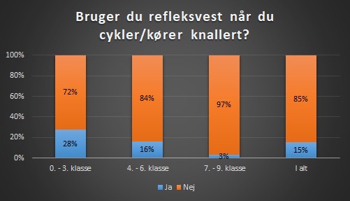 I 0. - 3. klasse har 28% af eleverne svaret, at de bruger refleksvest. I 4. - 6. klasse er det 16%, og i 7. - 9. klasse er det 3% af eleverne, der har svaret, at de bruger refleksvest.