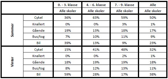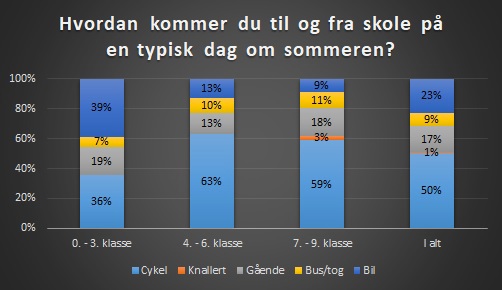 I 7. - 9. klasse har 59% af eleverne svaret, at de cykler til og fra skole om sommeren, 3% kører på knallert, 18% går, 11% kører i bus/tog og 9% bliver kørt i bil.