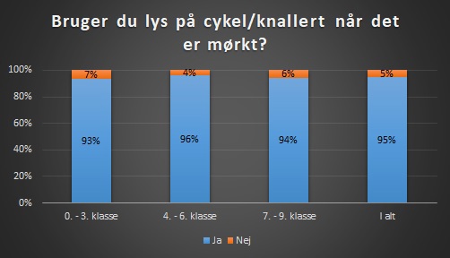 Samlet set har 95% af eleverne i Ikast-Brande Kommune svaret, at de bruger lys på cykel/knallert, når det er mørkt.
