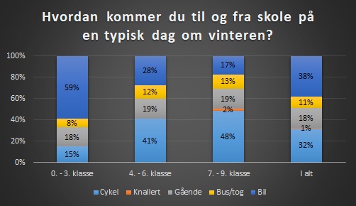 I 0. - 3. klasse har 15% af eleverne svaret, at de cykler til og fra skole om vinteren, 18% går, 8% kører med bus/tog og 59% bliver kørt i bil.