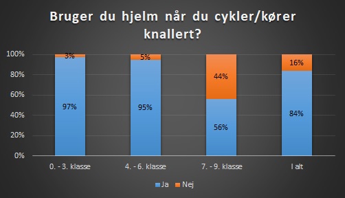 I 0. - 3. klasse har 97% af eleverne svaret, at de bruger cykelhjelm. I 4. - 6. klasse er det 95%, og i 7. - 9. klasse er det 56% af eleverne, der har svaret, at de bruger hjelm, når de cykler/kører knallert.
