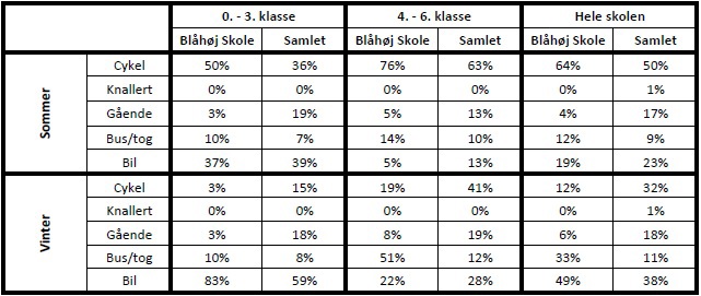 I ovenstående tabel ses det, at der er stor forskel på hvordan eleverne kommer til og fra skole henholdsvis sommer og vinter. For de mindste elever er der en stor andel, som cykler til og fra skole om sommeren, men som om vinteren bliver kørt i bil. For de ældste elever er der en stor andel af de elever, der cykler til og fra skole om sommeren, som istedet kører med bus/tog om vinteren.