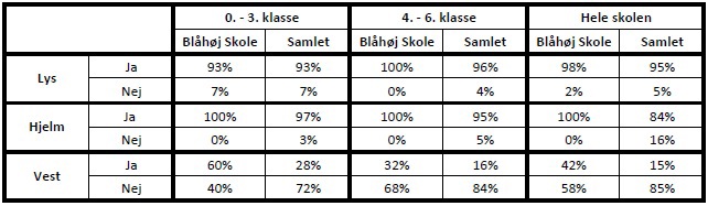I tabellen herunder er brugen af sikkerhedsudstyr for elever på Blåhøj Skole opsummeret og sammenlignet med hele kommunen.