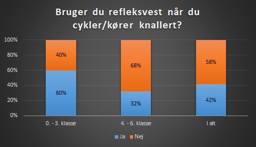 I 0. - 3. klasse har 60% af eleverne svaret, at de bruger refleksvest, når de cykler. I 4. - 6. klasse er det 32% af eleverne, der har svaret, at de bruger refleksvest.