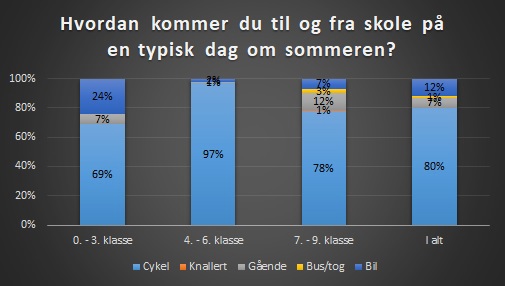 I 7. - 9. klasse har 78% af eleverne svaret, at de cykler til og fra skole om sommeren, 1% kører på knallert, 12% går, 3% kører med bus/tog og 7% bliver kørt i bil.