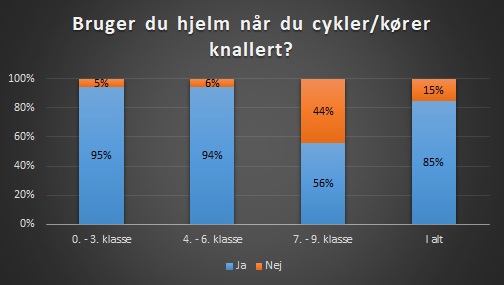 I 0. - 3. klasse har 95% af eleverne svaret, at de bruger cykelhjelm. I 4. - 6. klasse er det 94%, og i 7. - 9. klasse er det 56% af eleverne, der har svaret at de bruger hjelm.