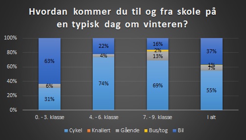 I 7. - 9. klasse har 69% af eleverne svaret, at de cykler til og fra skole om vinteren, 13% går, 2% kører med bus/tog og 16% bliver kørt i bil.