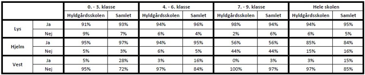 Eleverne på Hyldgårdsskolen har svaret på en række spørgsmål om deres brug af lys, hjelm og refleksvest. Disse besvarelser kan ses på figurerne herunder, hvor de ligeledes er sammenholdt med besvarelserne for hele kommunen.