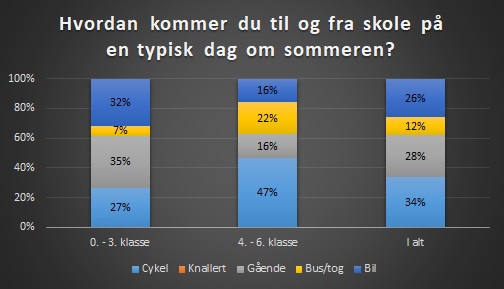 I 0. - 3. klasse har 27% af eleverne svaret, at de cykler til og fra skole om sommeren, 35% går, 7% kører med bus/tog og 32% bliver kørt i bil.