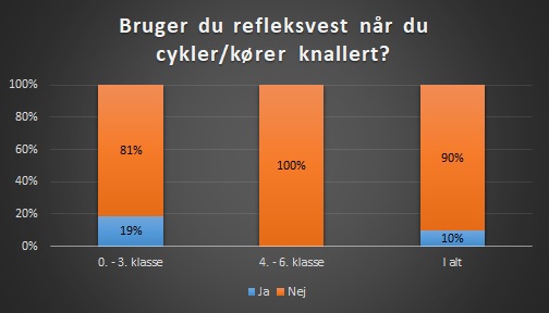 I 0. - 3. klasse har 19% svaret, at de bruger refleksvest. Ingen af eleverne i 4. - 6. klasse har svaret, at de bruger refleksvest.
