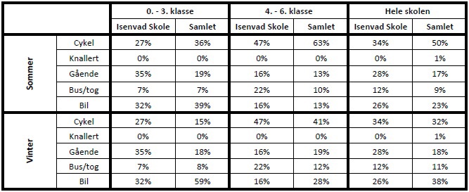 Ses der på Isenvad Skole samlet er der en lavere andel, der cykler om sommeren end gennemsnittet for hele kommunen, dog er der flere gående til og fra Isenvad Skole.
