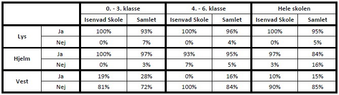 I tabellen herunder er brugen af sikkerhedsudstyr for elever på Isenvad Skole opsummeret og sammenlignet med besvarelserne for hele kommunen.