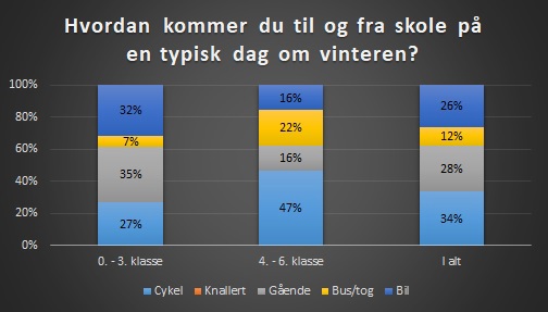 I 4. - 6. klasse har 47% af eleverne svaret, at de cykler til og fra skole om vinteren, 16% går, 22% kører med bus/tog og 16% bliver kørt i bil.