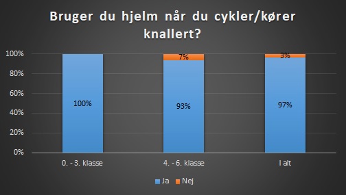 I 0. - 3. klasse har alle eleverne svaret, at de bruger cykelhjelm. I 4. - 6. klasse har 93% af eleverne svaret, at de bruger cykelhjelm.