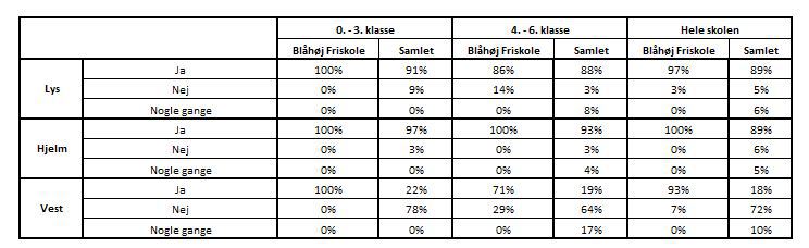 Samlet for Blåhøj Friskole viser tabellen, at betydelig flere benytter lys og hjelm end gennemsnittet. Kigger vi på brugen af refleksvest, ligger Blåhøj Friskole enormt højt i forhold til gennemsnittet for hele kommunen.