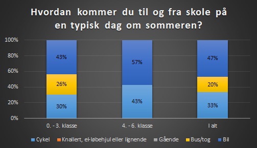 I 0. - 3. klasse svarede 30% af eleverne, at de cykler til og fra skole om sommeren, 26% kører med bus/tog og 43% bliver kørt i bil.