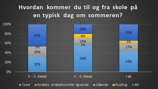 I 0. - 3. klasse har 32% af eleverne svaret, at de cykler til og fra skole om sommeren, 20% går, 1% kører i bus/tog og 47% bliver kørt i bil.