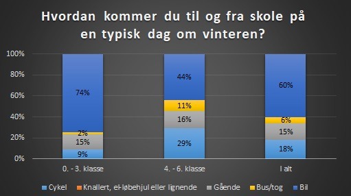 I 0. - 3. klasse har 9% af eleverne svaret, at de cykler til og fra skole om vinteren, 15% går, 2% kører i bus/tog og 74% bliver kørt i bil.