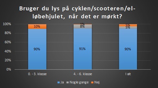 I 0. - 3. klasse har 90% af eleverne svaret, at de bruger lys på cyklen, når det er mørkt. I 4. - 6. klasse er det 91%, der har svaret, at de bruger lys på cyklen, når det er mørkt.