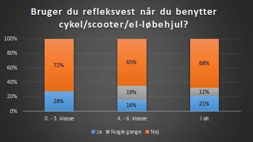I 0. - 3. klasse har 28% af eleverne svaret, at de bruger refleksvest. I 4. - 6. klasse har 16% af eleverne svaret, at de bruger refleksvest.