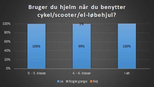 I 0. - 3. klasse har 100% af eleverne svaret, at de bruger hjelm, når de cykler. I 4. - 6. klasse er det 99%, der har svaret at de bruger hjelm.