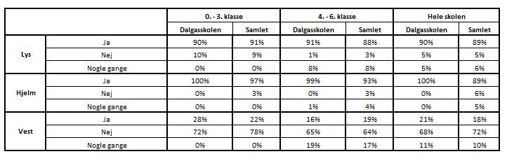 I tabellen herunder er brugen af sikkerhedsudstyr for elever på Dalgasskolen opsummeret og sammenlignet med hele kommunen.