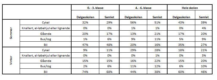 I ovenstående tabel ses det, at eleverne i 0. - 3. klasse og 4. - 6. klasse på Dalgasskolen er lidt bedre til at cykle til og fra skole, end gennemsnittet for hele kommunen, om sommeren. Om vinteren ligger begge klassetrin tæt på gennemsnittet for hele kommunen. I 0. - 3. og 4. - 6. klasse klasse kører færre med bus en gennemsnittet. Kigger vi på bilen som transportmiddel følger 0. - 3. klasse gennemsnittet for hele kommunen om sommeren, hvor imod de om vinteren ligger noget over gennemsnittet. For 4. - 6. klasse gælder det, at de både om sommeren og vinteren oftere, end gennemsnittet for hele hele kommunen benytter bilen som transportmiddel. Ser vi på hvor mange der går i skole, så går 0. - 3. klasse oftere end gennemsnittet om sommeren, hvor de om vinteren ligger på niveau med gennemsnittet. 4. - 6. klasse går noget mindre end gennemsnittet, både sommer og vinter.