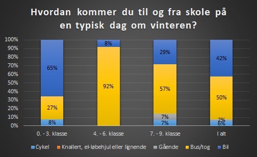 I 0. - 3. klasse har 8% af eleverne svaret, at de cykler til og fra skole om vinteren, 27% kører med bus/tog og 65% bliver kørt i bil.