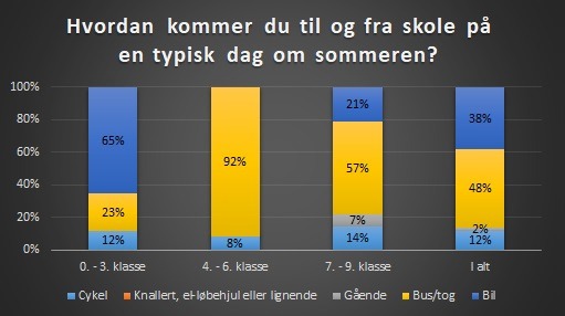 I 0. - 3. klasse har 12% af eleverne svaret, at de cykler til og fra skole om sommeren, 0% går, 23% kører med bus/tog og 65% bliver kørt i bil.