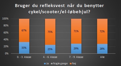 I 0. - 3. klasse har 33% af eleverne svaret, at de bruger refleksvest. I 4. - 6. klasse er det 25%, og i 7. - 9. klasse er det 29%, der har svaret, at de bruger refleksvest.