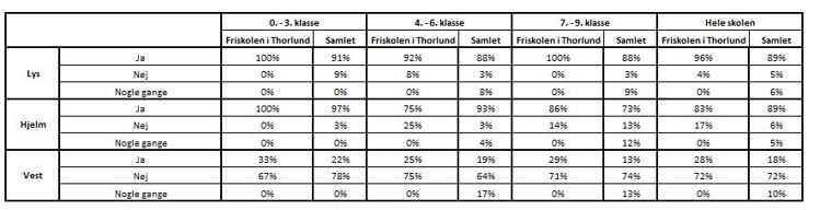 I tabellen herunder er brugen af sikkerhedsudstyr for elever på Friskolen i Thorlund opsummeret og sammenlignet med hele kommunen.