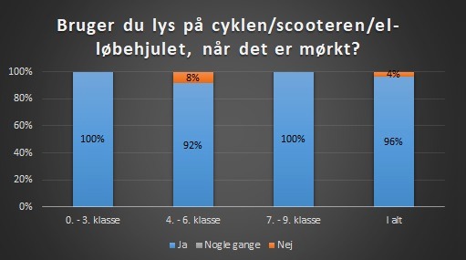Alle eleverne i 0. - 3. klasse har svaret at de bruger lys på cyklen, når det er mørkt. I 4. - 6. klasse er det 92%, og i 7. - 9. klasse er det alle eleverne, der har svaret, at de bruger lys på cyklen/scooteren/el-løbehjulet, når det er mørkt.