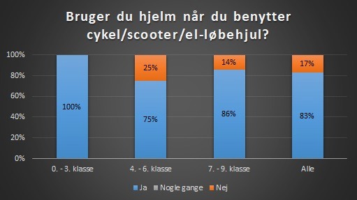 I 0. - 3. klasse har alle elever svaret, at de bruger cykelhjelm. I 4. - 6. klasse er det 75%, og i 7. - 9. klasse er det 86% af eleverne, der har svaret, at de bruger hjelm.