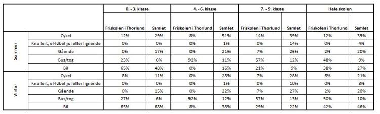 I tabellen herunder er transportvanerne for Friskolen i Thorlund opsummeret og sammenlignet med gennemsnittet for alle skoler i hele kommunen.