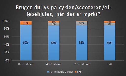 I 0. - 3. klasse har 90% af eleverne svaret, at de bruger lys på cyklen, når det er mørkt. I 4. - 6. klasse er det 88%, og i 7. - 9. klasse er det 89% af eleverne, der har svaret, at de bruger lys på cyklen/scooteren/el-løbehjulet, når det er mørkt.