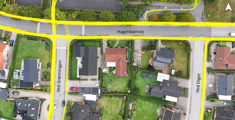 Der er otte elever, der kommer cyklende nordpå ad Ved Diget, hvorefter de står af cyklen og begynder at trække cyklen af fortovet mod lyskrydset, jf. figur 4. De indgår således ikke på ovenstående figur, da de er registreret som fodgængere i kortudsnittet. Adfærden kan skyldes, at cyklisterne er utrygge ved at cykle på/krydse Hagelskærvej, hvilket kan skyldes vejens bredde, trafikmængde eller hastighed.