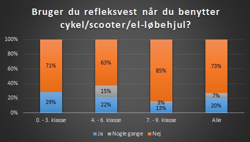 I 0. - 3. klasse har 29% af eleverne svaret, at de bruger refleksvest. I 4. - 6. klasse er det 22%, og i 7. - 9. klasse er det 13%, der har svaret, at de bruger refleksvest.