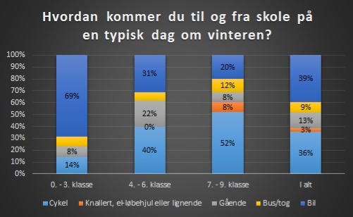 I 7. - 9. klasse har 52% af eleverne svaret, at de cykler til og fra skole om vinteren, 8% kører scooter eller el-løbehjul, 8% går, 12% kører med bus/tog og 20% bliver kørt i bil.