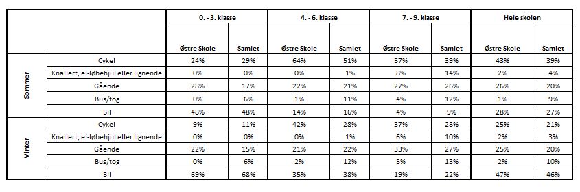 I tabellen herunder er transportvanerne for Ikast Østre Skole opsummeret og sammenlignet med gennemsnittet for alle skoler i kommunen.