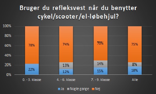 I 0. - 3. klasse har 22% af eleverne svaret, at de bruger refleksvest, når de cykler. I 4. - 6. klasse er det 12% og i 7. - 9. klasse er det 15% af eleverne, der har svaret, at de bruger refleksvest.