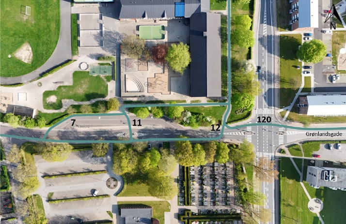 I krydset Jyllandsgade/Grønlandsgade/Gl. Skolevej blev der observeret en del fodgængere, som krydsede både Grønlandsgade og stierne fra Sønderparken. Der var i optageperioden skolepatrulje på stedet, som guidede eleverne igennem signalanlægget.